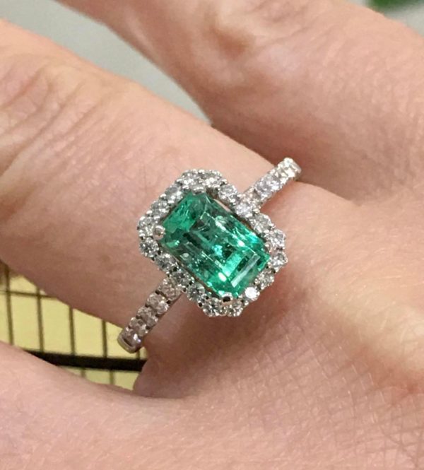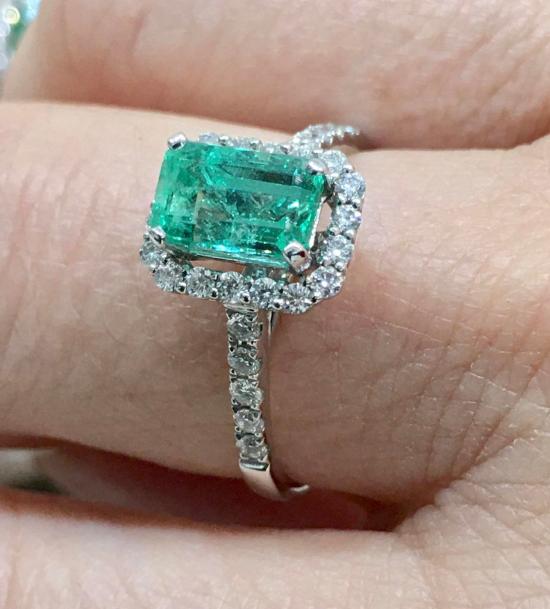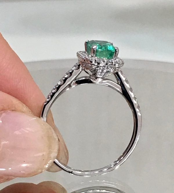 Anello in oro bianco 18kt con smeraldo colombiano vero naturale con diamanti top wesselton taglio Amsterdam moderno.