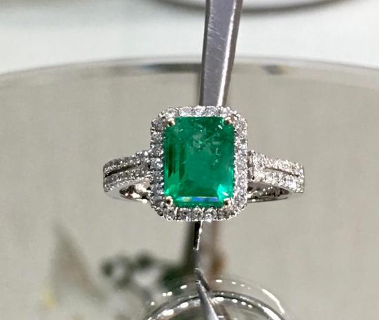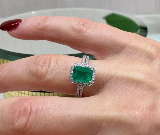 Anello in oro bianco 18kt con smeraldo Colombia vero naturale taglio smeraldo con diamanti top wesselton taglio Amsterdam moderno.