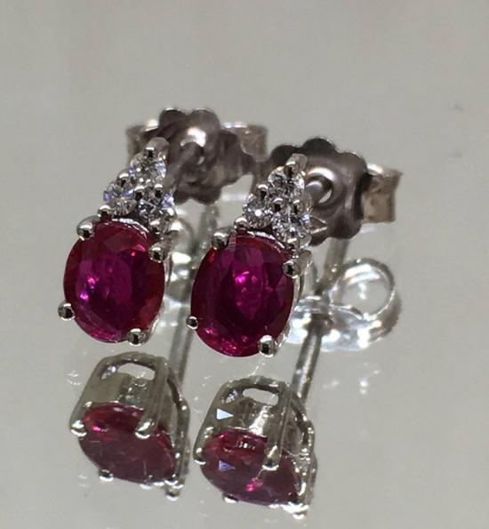 Orecchini in oro bianco 18kt con diamanti veri naturali taglio rotondo a brillante e rubini veri naturali. Perno e farfallina.